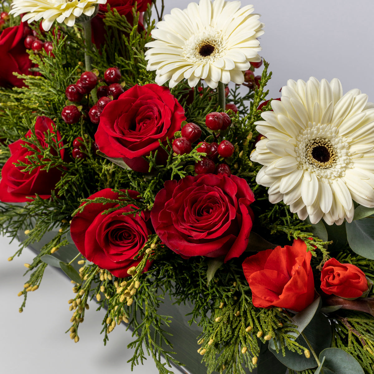 DON’T remove the roses from the box; they are secure and happy there. They lid is meant to stay on the side or bottom of the box. Be mindful when carrying the arrangement; it’s a very delicate product.