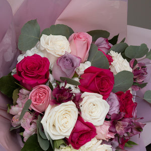 Some rose colors may vary depending on the season. The decorative paper is handpicked by our florists, ensuring a harmonious combination with the chosen colors.